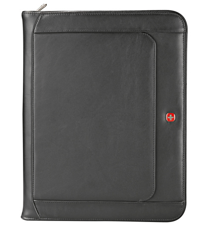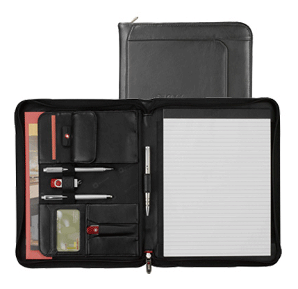 Features: Front organizational pocket. Interior organizer features innovative snap-back USB holder flash drive pocket, gusseted documents pocket, clear ID window, knife/pen pocket, business card pockets, UltraHyde storage pocket with Velcro closure, and three elastic storage loops for USB memory drives, writing instruments, etc. Ambidextrous paper pad holder. Includes 8 1/2" x 11" lined notepad. Comes in a gift box.